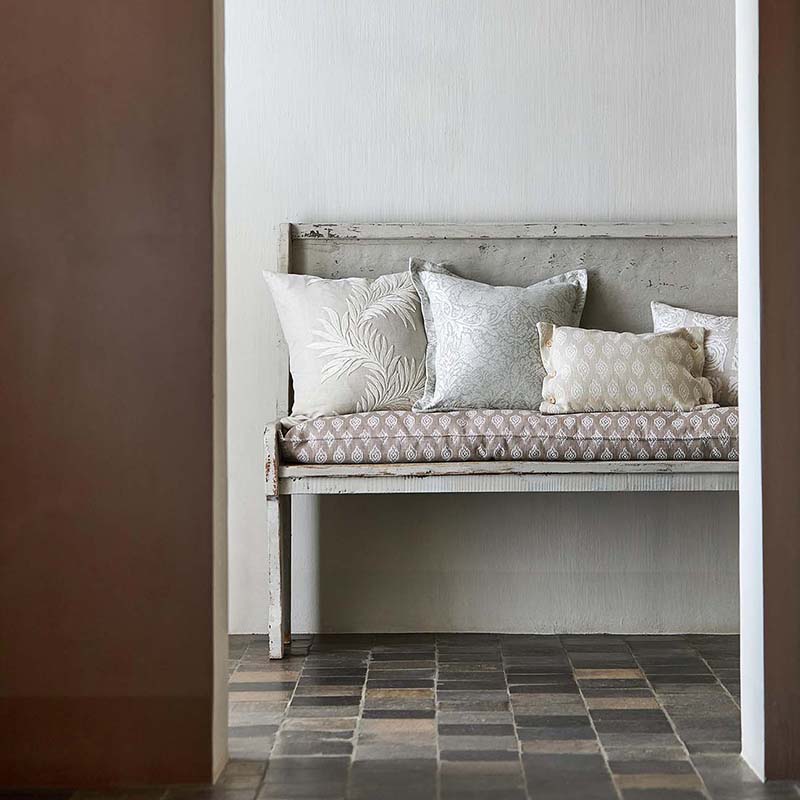 1875年デザインのプリント生地“Marigold”にインスピレーションを得た葉のトレイル柄。コットンリネンの地に手作業を交えながらコード刺繍を施しています。美しい刺繍とシンプルなデザインで、「Pure Marigold」のプリント生地や壁紙とコーディネーション使いが可能です。ライトグレー、リネンの2色展開。